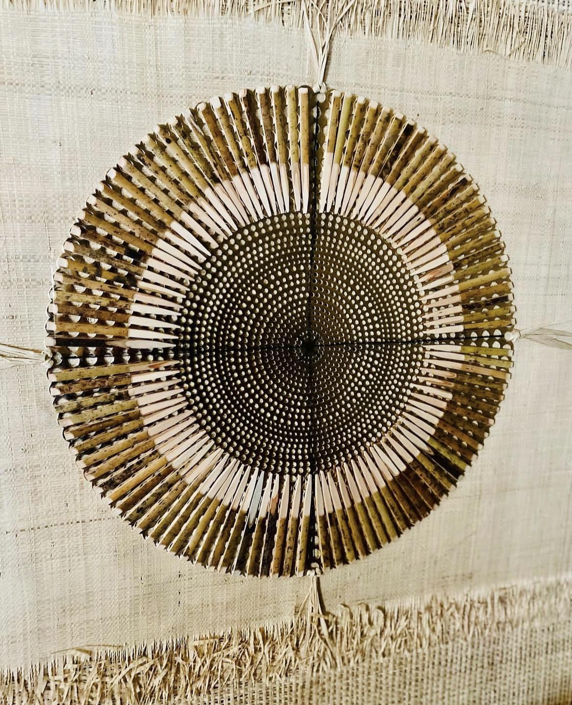 Bouclier 3 Artiste : Hélène Eloy Série 2022 – Boucliers des 4 Directions Technique mixte, jute, raphia, bois, corde, plastique 80/60cm