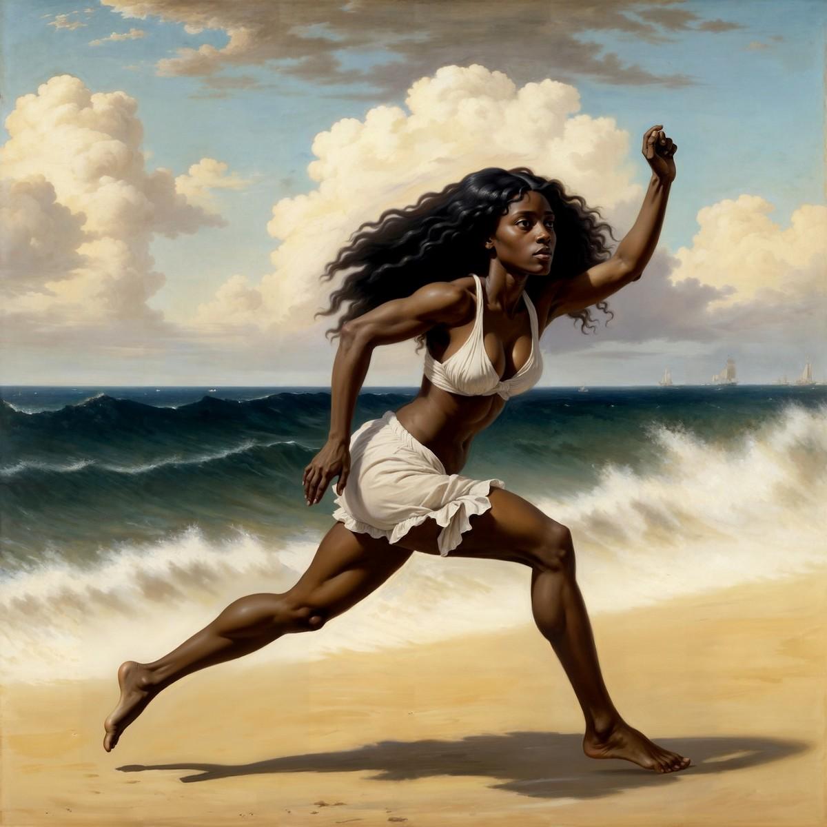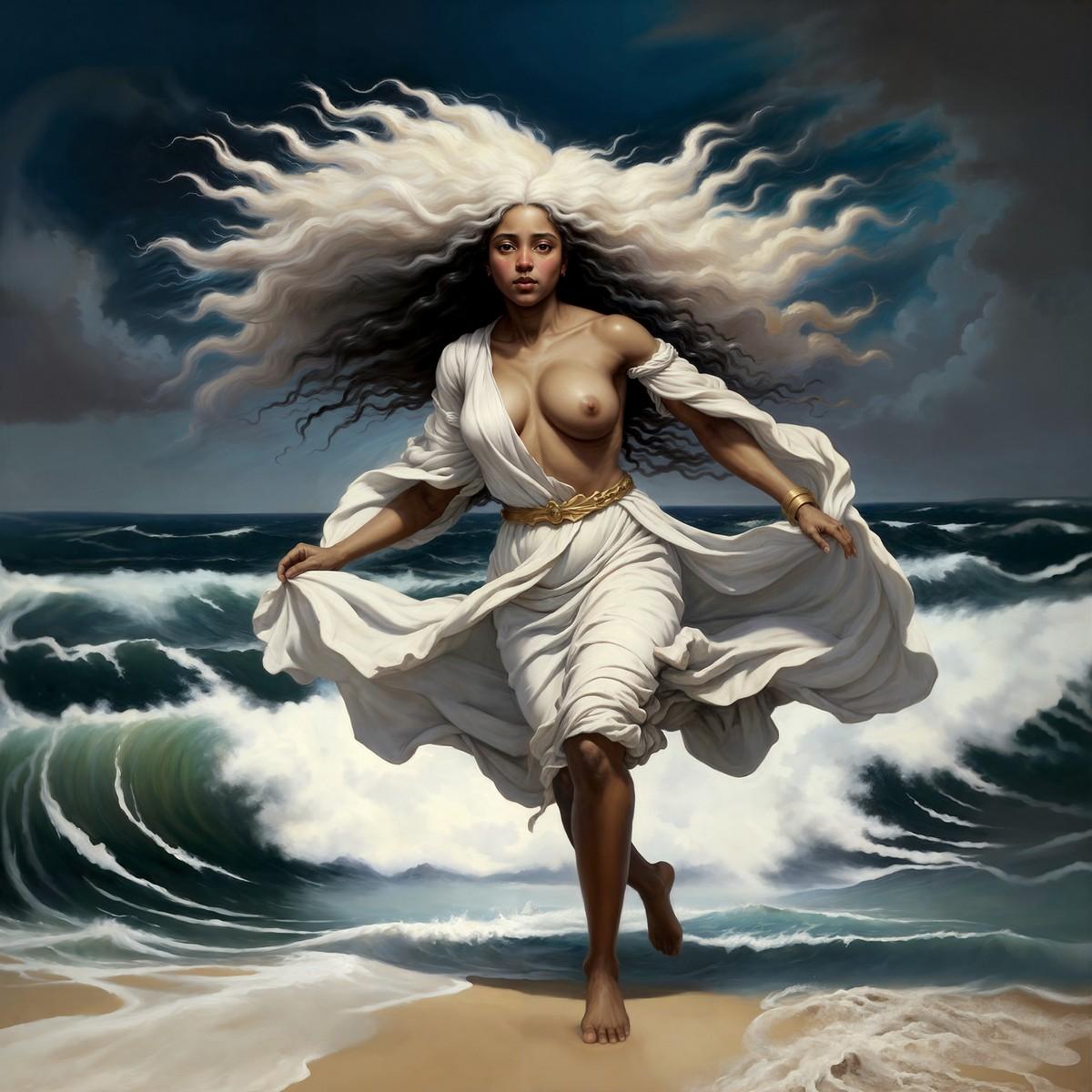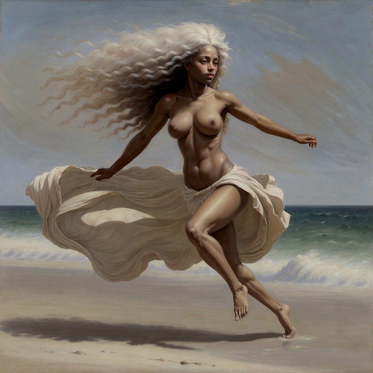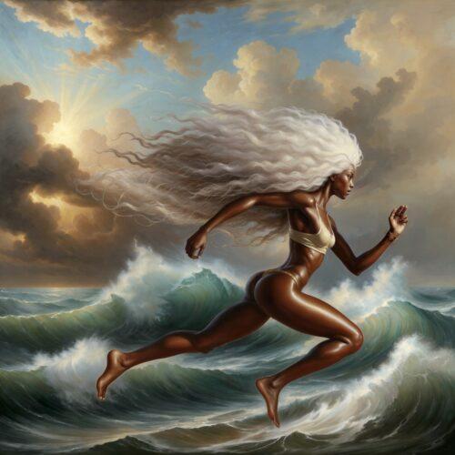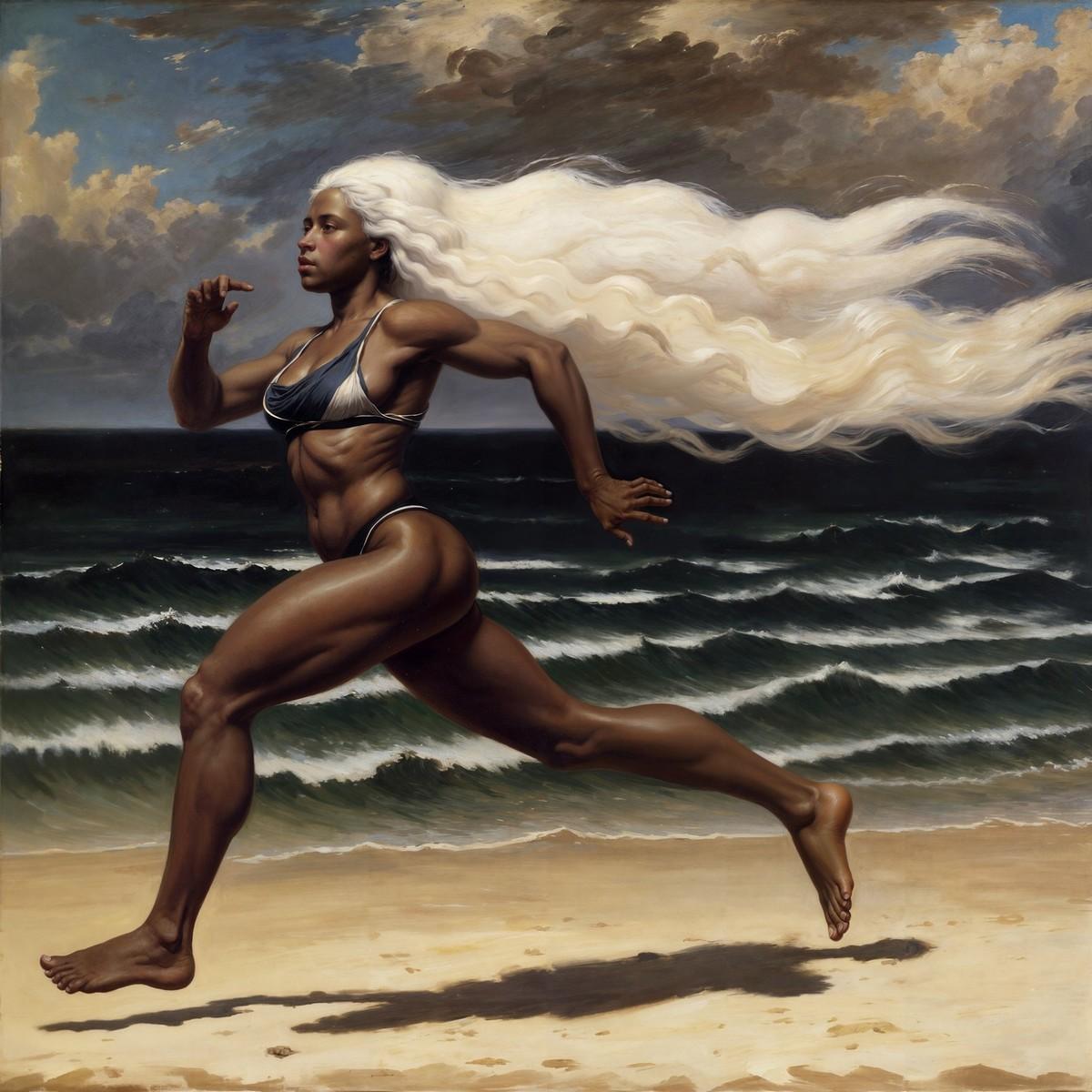 Cette série de femmes courant sur la plage est à la base un hommage à un personnage de bandes dessinées : Ororo est une femme qui contrôle la météo, ce qui fait d’elle une sorte de déesse du vent. Dans une approche picturale très proche de la peinture classique, qui sert très efficacement les thématiques épiques ou mythologiques, cette série allie héroïsme, noblesse, force et élégance.