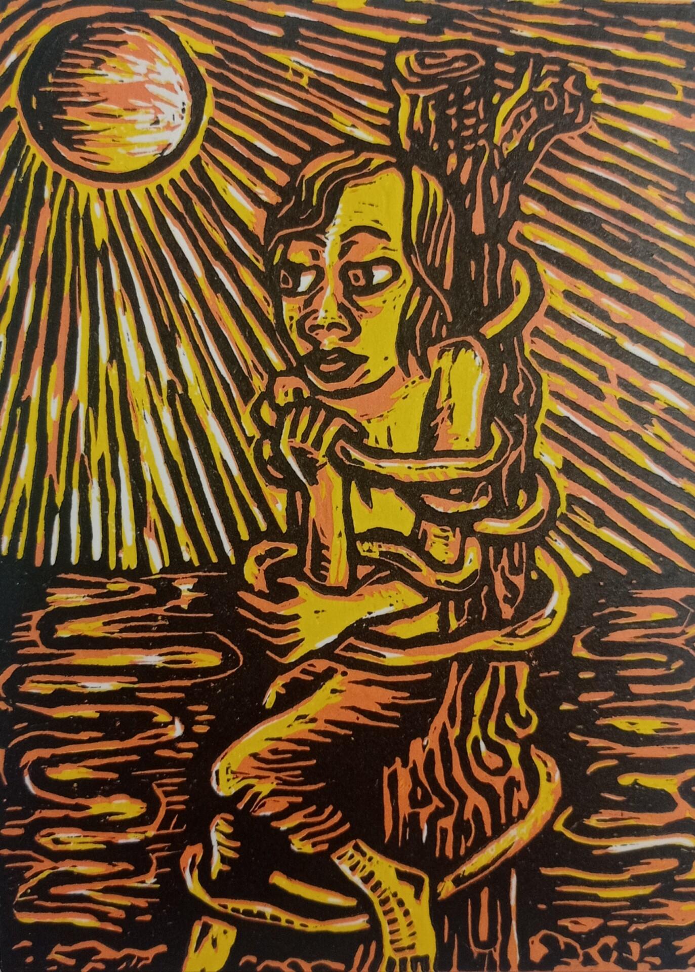 Soleil de la délivrance Artiste : Franck Dudin Estampe (Gravure à l’épargne en trois couleurs) Format de l’image 15/21 estampée sur Papier d’Art 21/29,7 Tirage limité